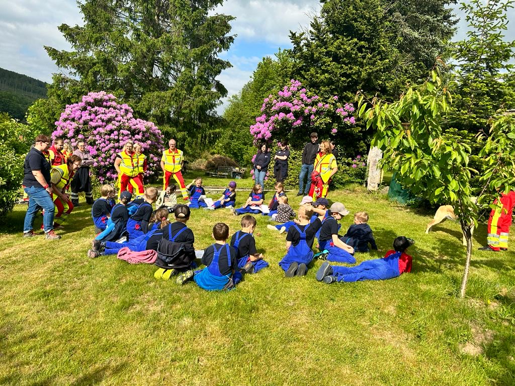 Die Suche ist aber auch im Garten gar nicht so einfach.Denn die Hunde gehen nicht nach ihren Augen, sondern nach dem Geruch. Wenn dann noch 25 Kinder und 12Erwachsene in dem Garten sind, waren das wirklich erschwerte Bedingungen. Deshalb mussten wir auch immer hinter der Hundeführerin bleiben, so dass Lotte sie gut wieder finden konnte um den Fund der Vermissten anzuzeigen.