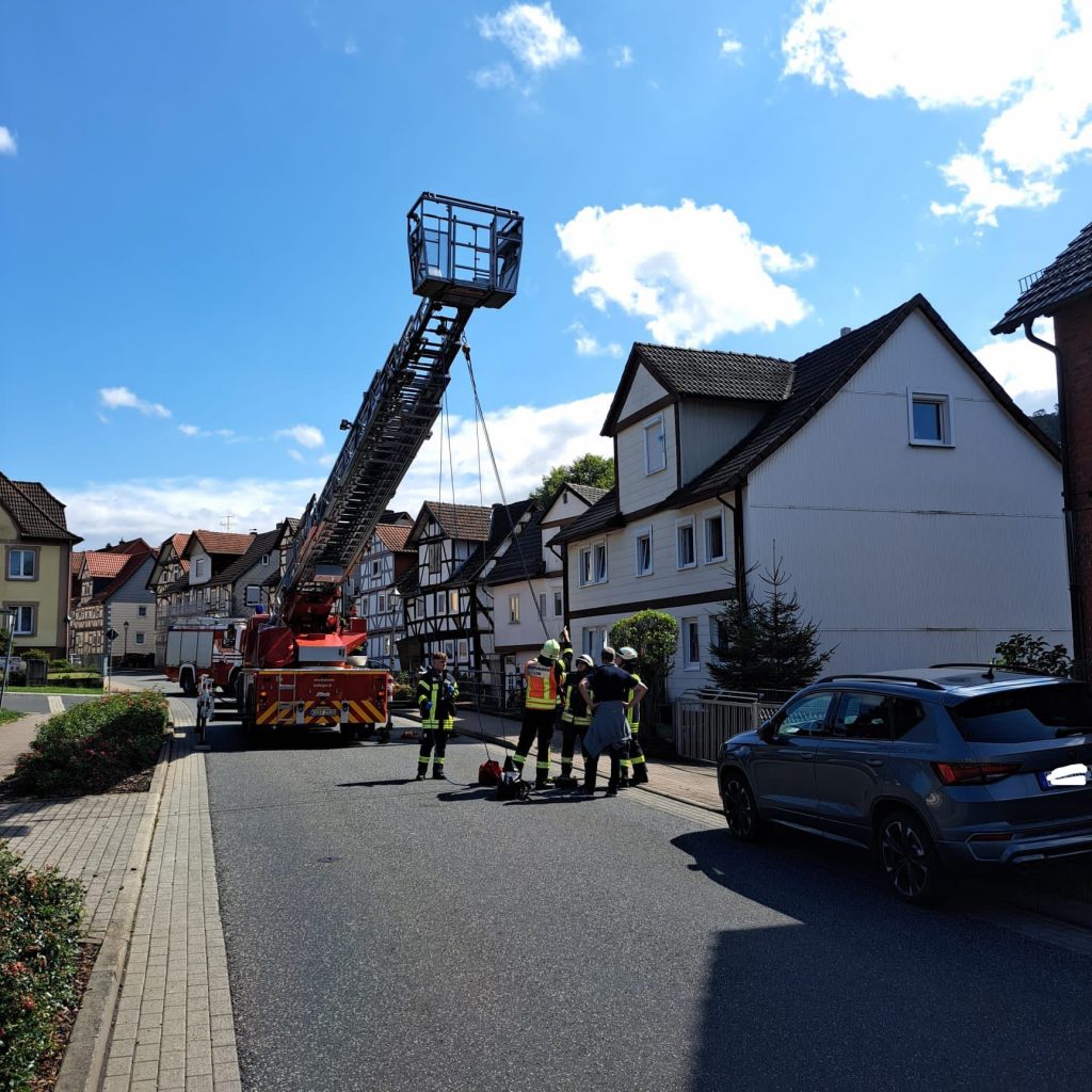 Zusammen mit der ebenfalls alarmierten Kameraden der Feuerwehr Kaufungen wurde der Patient schnell, sicher und schonend mit Hilfe der Drehleiter gerettet und wieder an den Rettungsdienst zur weiteren Behandlung übergeben.