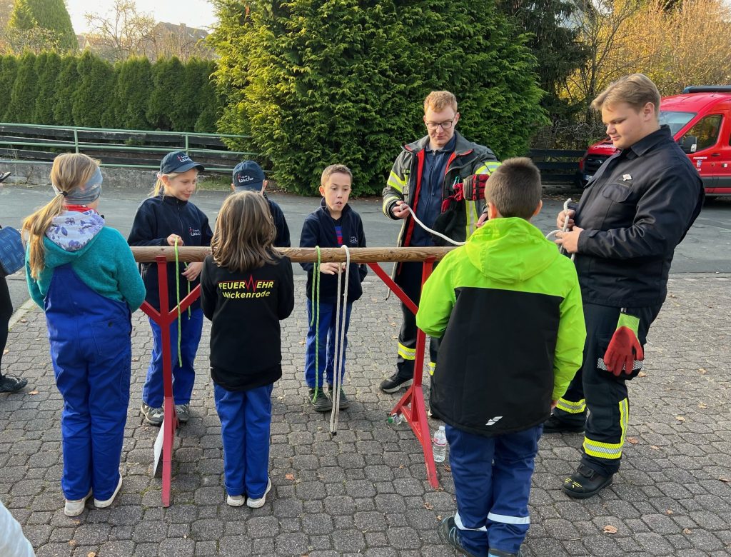 Bei einer weiteren Station konnten die Kinder ihre Fähigkeiten bei den Knoten beweisen. Sie sollten die Feuerwehrknoten benennen und mindestens einen Feuerwehrknoten zeigen. In einer super Teamarbeit sind hier 3 Knoten zusammen gekommen.