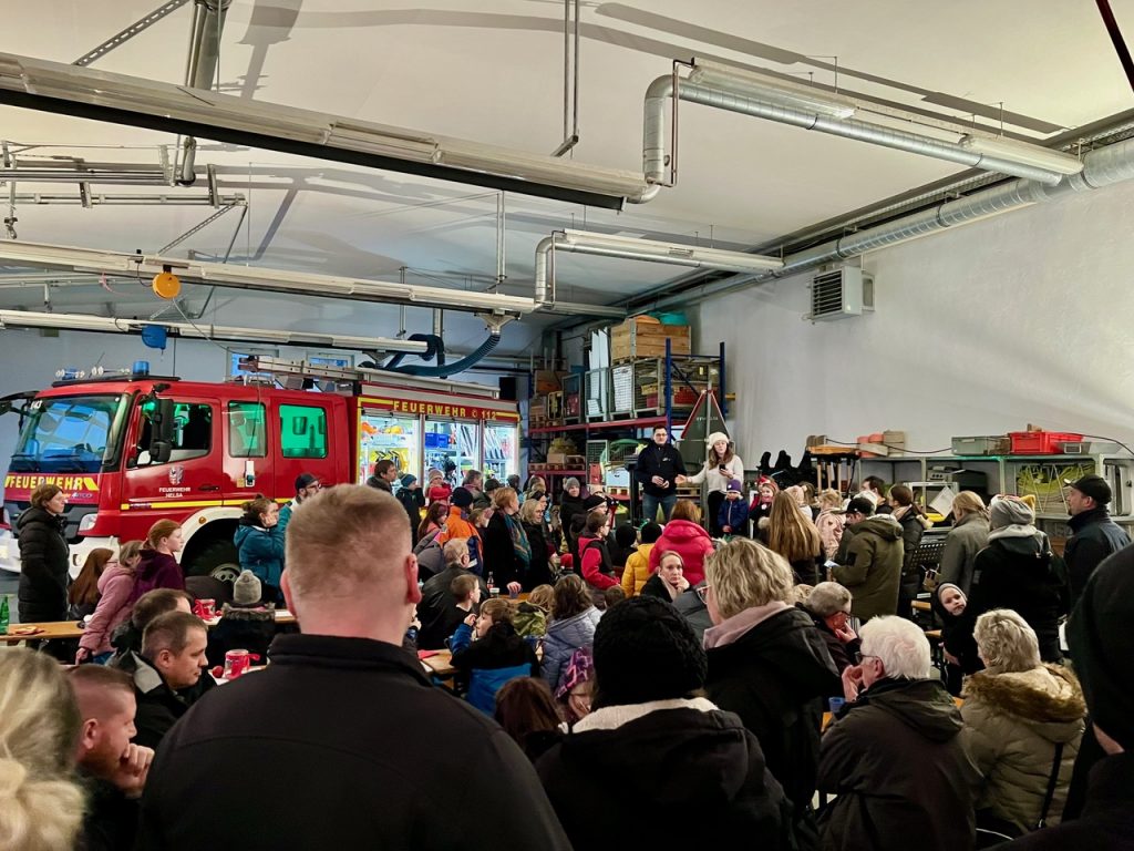 Nachdem der Einsatz abgearbeitet war, konnte der Rest für das Fest aufgebaut werden. Beim Vergleich der Wetterapps, waren diese sich leider einig, dass es konstant weiter regnen soll. Also mussten wir umdisponieren und die Bühne für den Auftritt der Kita Lossespatzen und den Chor der Schäferlandschule in die Fahrzeughalle verlegen.