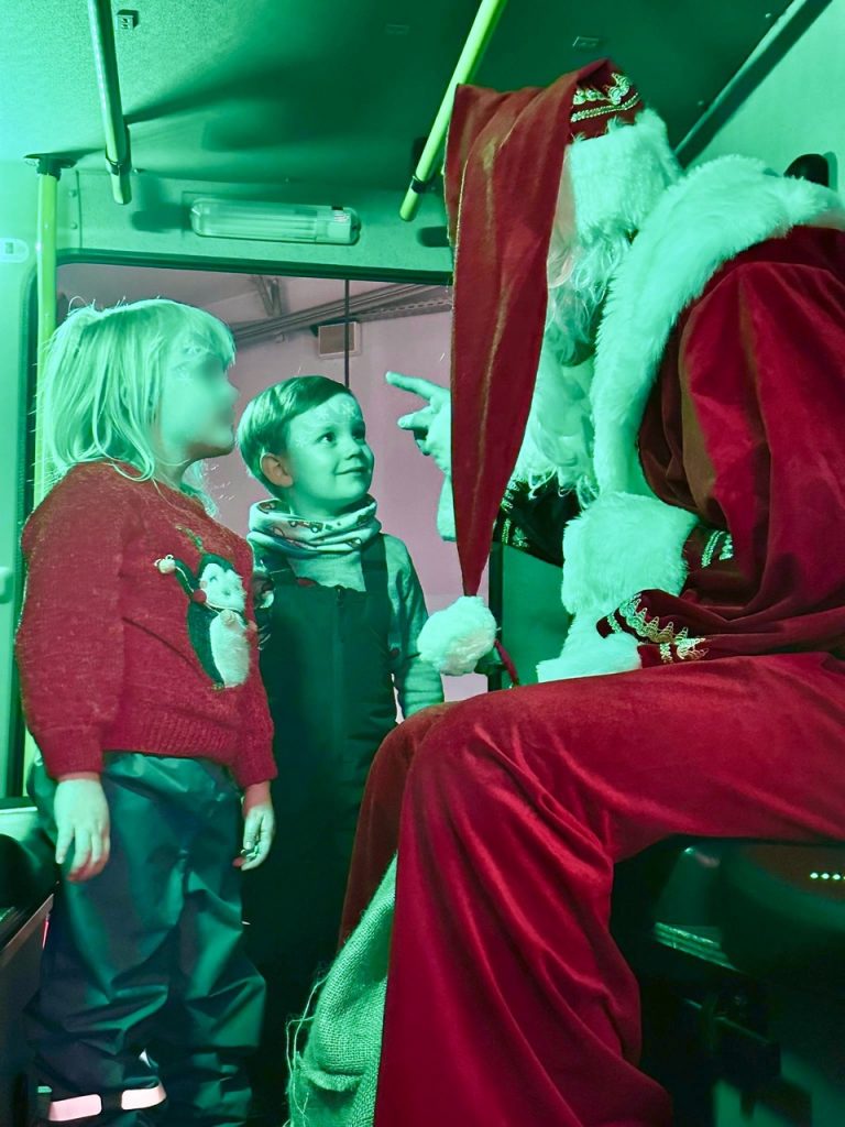 Bald danach hörten wir schon Glocken klingen. Der Nikolaus, hatte sich auch bei dem Mistwetter auf den Weg zum Feuerwehrhaus gemacht. Natürlich konnte er nicht wie sonst, die Kinder draußen begrüßen und so nahm er kurzerhand im Feuerwehrauto Platz und die Kinder konnten sich zu ihm setzen. Das war für viele ein doppeltes Highlight, den Nikolaus auch noch im Feuerwehrauto zu treffen. Dementsprechend war die Schlange der wartenden Kinder sehr lang. Aber der Nikolaus hat sich für alle Zeit genommen. Nach dem die Kinder ihm „Hallo“ gesagt hatten und mit einer kleinen Überraschung verabschiedet wurden, musste der Nikolaus schon wieder weiter.