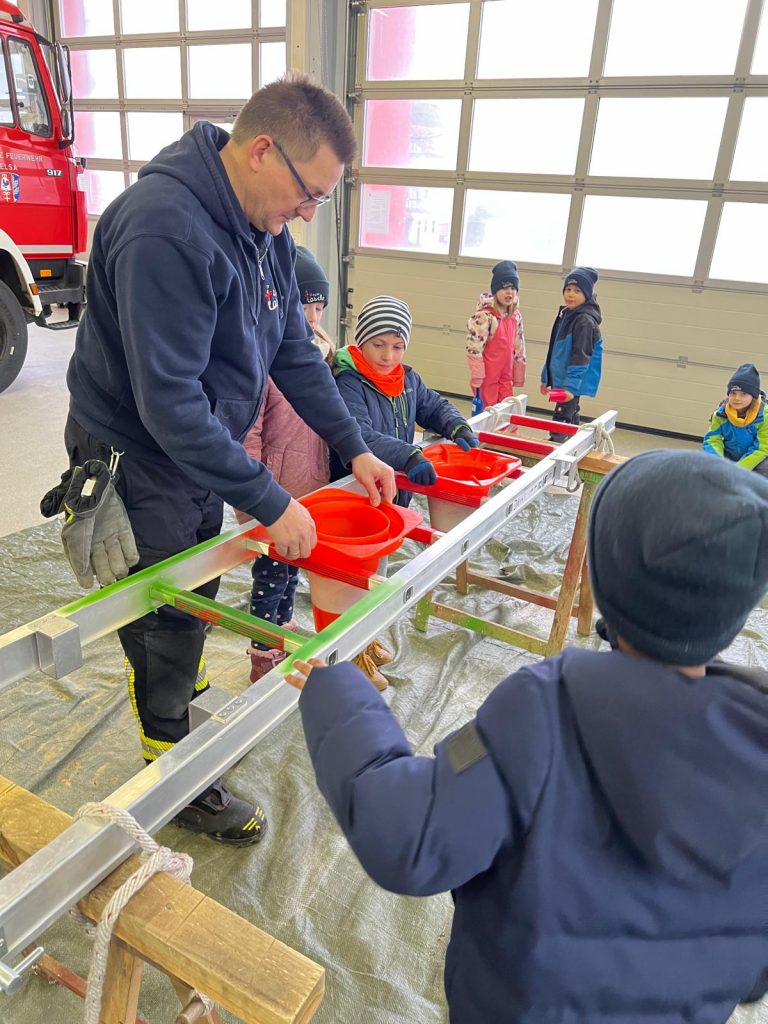 Nach dem die Kids angetreten waren wurden sie in verschiedenen Gruppen eingeteilt um ein etwas koordinierten Ablauf zu schaffen. Dann wurde die Station von den Kindern aufgebaut. Hier wurde eine Leiter auf zwei Böcke gelegt und umgedrehte Pylonen als Trichter umfunktioniert. Das Gestell mit der Leiter funktioniert bei der Menge an Kindern jedoch nicht so optimal und so musste kurzerhand umdisponiert werden. Genau wie es die Kameradinnen und Kameraden im Einsatzfall machen, falls etwas nicht funktioniert.