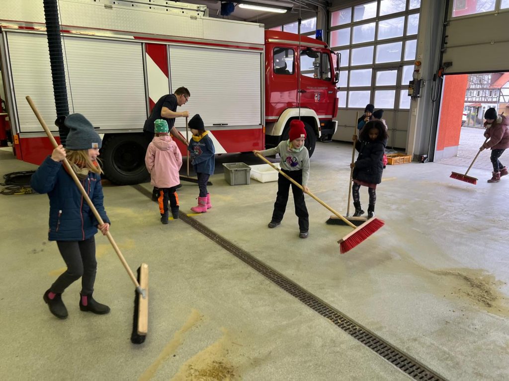 Natürlich ging bei der ganzen Arbeit auch das ein oder andere Häufchen Sand daneben und so musste anschließend die Fahrzeughalle gekehrt und vom Sand befreit werden. Sozusagen die Einsatzbereitschaft wieder hergestellt. Genauso wie bei den Großen. Und so bekommen auch die Kleinsten schon einen Eindruck vom Feuerwehrdienst auch wenn sie noch nicht alles machen dürfen.