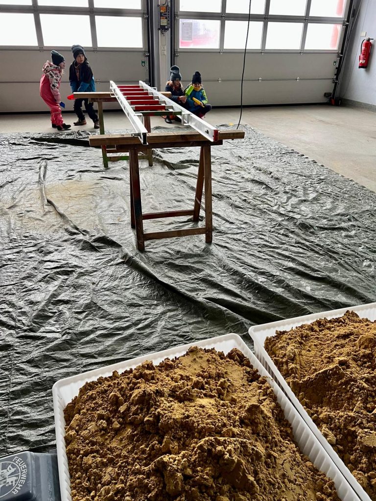 Bereits im Vorhinein hat der Bauhof uns etwas Sand zur Verfügung gestellt, der vorübergehend in der Fahrzeughalle gelagert wurde.