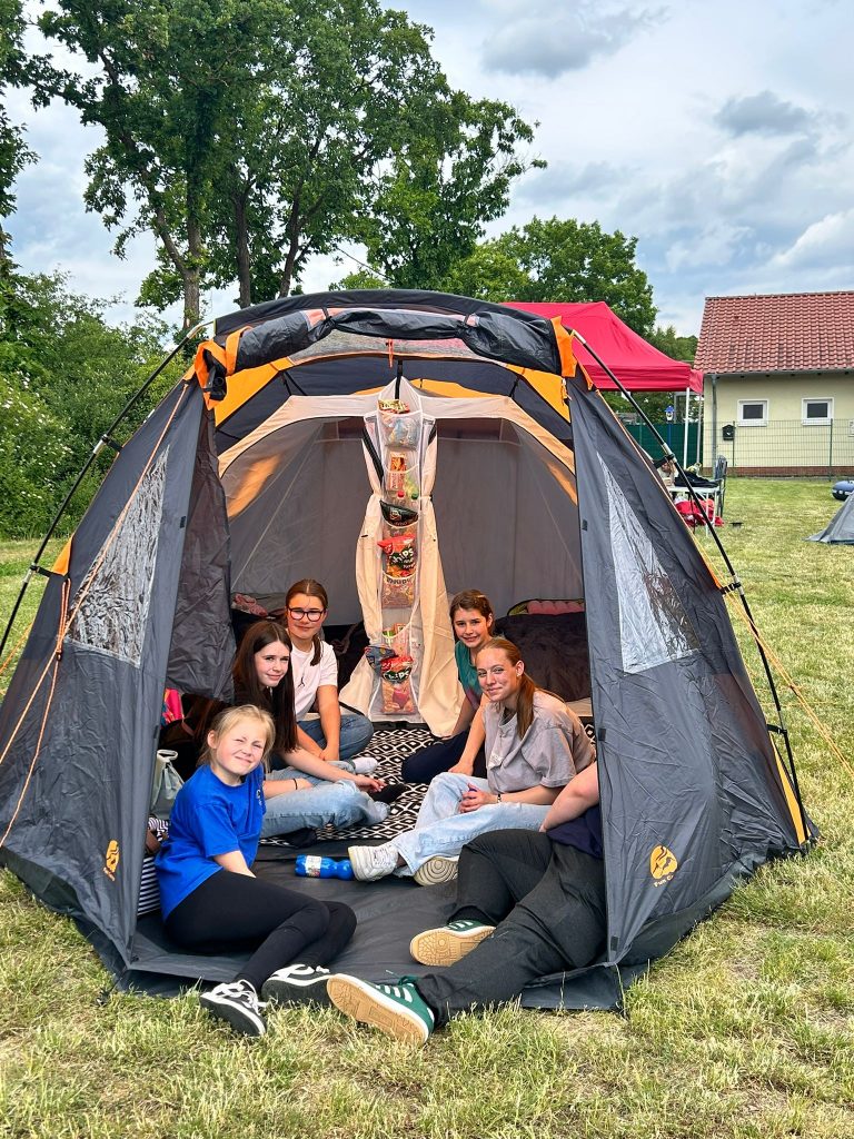 Als alles stand, erkundeten wir das Gelände. Manche drehten eine Runde um den See, andere schauten sich einfach mal alles an oder spielten eine Runde Volleyball auf dem Platz in der Nähe. Zum Mittagessen gab’s Bratwurst im Brötchen – einfach, aber lecker. Am Nachmittag konnten wir machen, worauf wir Lust hatten: chillen, spielen, quatschen. Richtig entspannt.