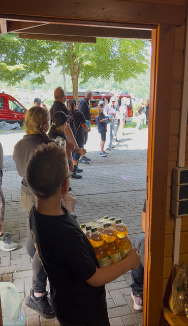 Beim Aufbau der Verpflegungstationen wurde kurzerhand eine Kette gebildet um die vielen Getränkepackungen zu verteilen. Das war dann schon die erste Team-Building Aktion für alle. Als wir die Spiele und Verpflegung aufgebaut hatten, war es auch schon so weit und die Kinder wurden durch die Eltern zum Honighof gebracht. Nachdem jede Feuerwehr einzeln die Anwesenheit fest gestellt hatte, sind alle Kinder und Jugendlichen angetreten. Obwohl einige gefehlt haben, ist es dennoch ein beeindruckendes Bild. Es ist so schön zu sehen, dass die Kinder- und auch die Jugendfeuerwehr in allen 3 Ortsteilen so gut angenommen wird.