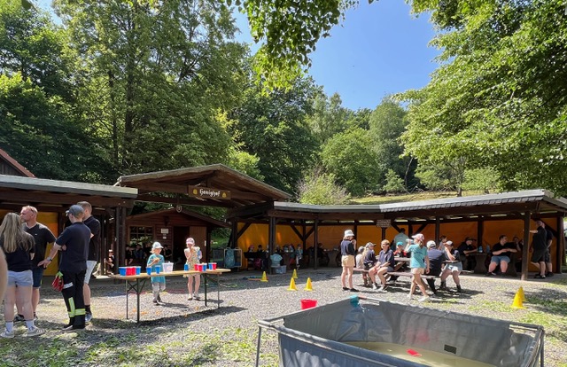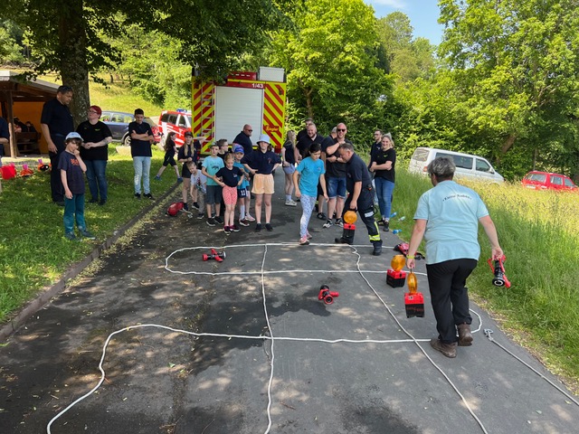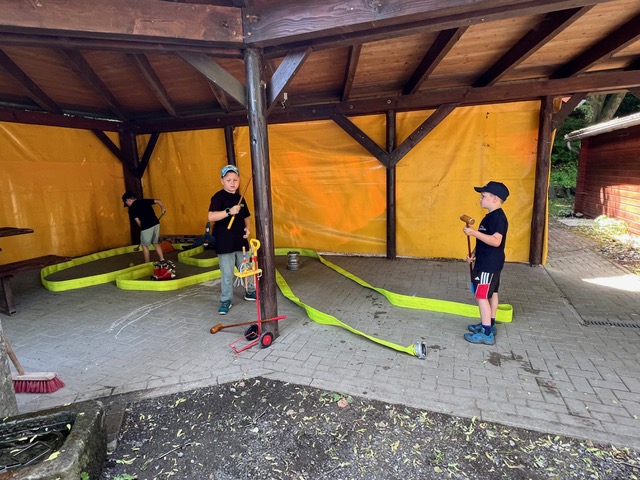 Außerdem konnten sie Fußball und auch Badminton spielen oder sich bei einer Partie Stadt-Land-Fluss entspannen. Für die bereitgestellten Fallklappen reichte der Wasserdruck aus der Kübelspritze nicht aus. So wurde diese kurzerhand für eine Erfrischung umfunktioniert und die Kids haben sich gegenseitig nass gespritzt.