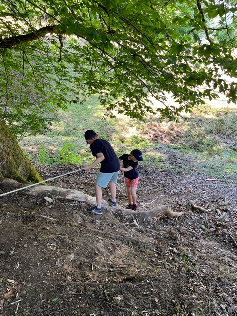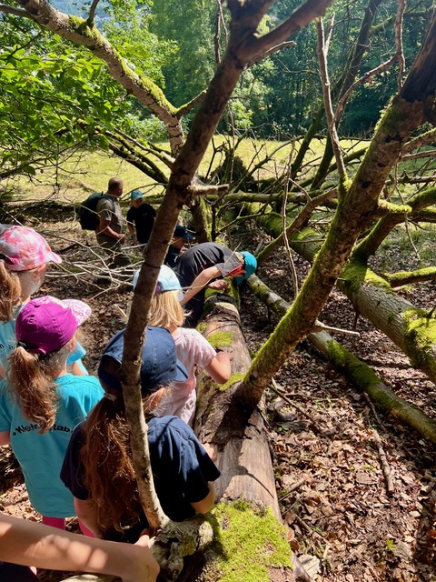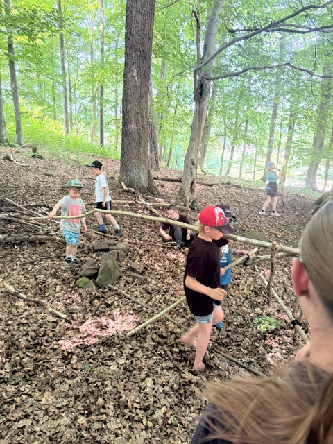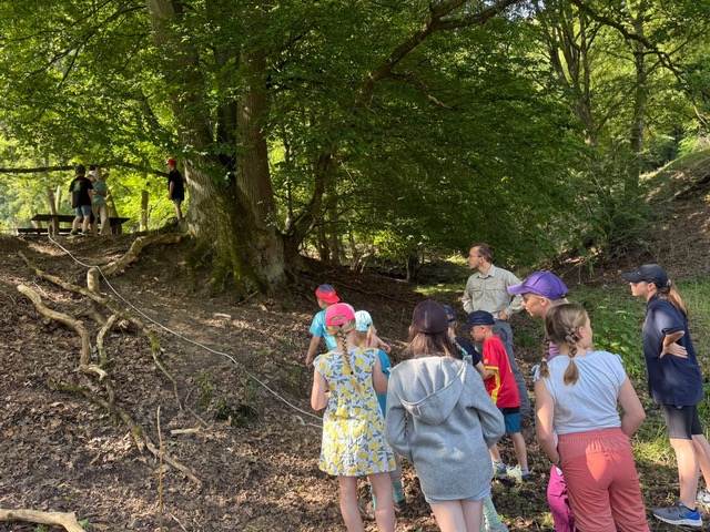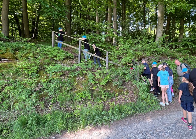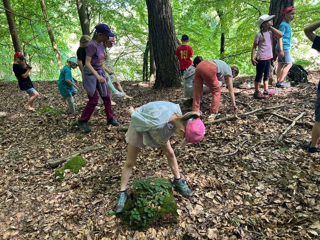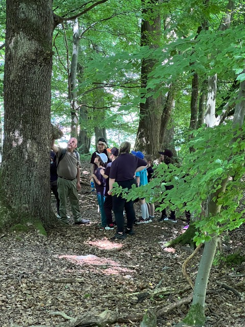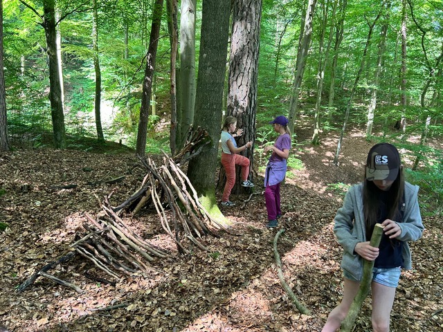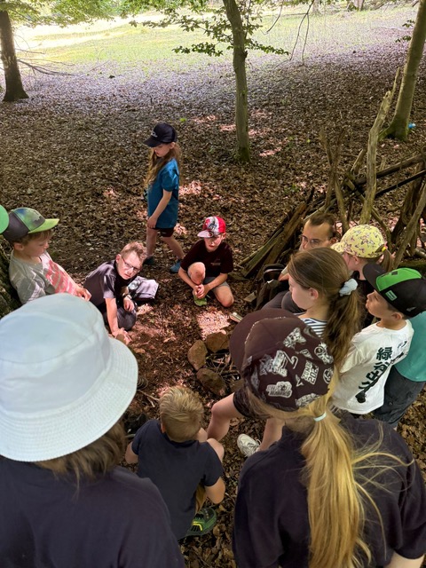 Beim Überleben im Wald ist die Gruppe mit dem Ranger Richtung Wald gelaufen. Dort angekommen hat der Ranger eine Geschichte erzählt. Die Gruppe ist in einem Flugzeug Richtung Schweden, aber das Flugzeug musste Notlanden. Es gab keine verletzten Passagiere, aber zur Verpflegung war nur noch Wasser vorhanden. Die Kinder wurden noch einmal in Gruppen eingeteilt um Verpflegung, Unterkunft, Wasser undLage zu prüfen. Die Kinder sind dann los und haben geschaut was sie Essbares finden oder wo eine Wasserquelle ist und wo ein Unterschlupf gebaut werden kann. Es wurden verschiedene Pflanzen gesammelt und der Ranger erklärte etwas dazu. So ging es dann weiter in den Wald und die Kinder lernten, sich wie ein Fuchs zu bewegen und sich leise und ruhig anzuschleichen. Anschließend wurden noch Äste gesammelt um sich Unterkünfte zu bauen. Zum Schluss ging es zur Wasserquelle und die Kinder haben noch erfahren, welche Materialien für ein Lagerfeuer benötigt werden.