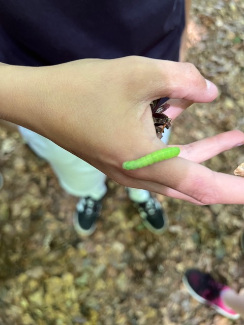 Nach der Mittagspause wurden die Gruppen getauscht und es ging für die anderen noch einmal in den Wald. Bei der Spurensuche im Wald ging es darum aufmerksam durch den Wald zu gehen und verschiedene Spuren oder auch Tiere zu finden. Gleich zu Anfang wurden erst einmal verschiedene Wildkräuter am Wegesrand bestimmt. Da waren die Namen schon sehr interessant. Weiter haben wir geschaut, was bei einem toten Baum für Leben unter der Rinde sein kann. Auch warum ein Baum eine „Nase“ bekommt haben wir gelernt.Offensichtlich waren die Spuren der Wildschweine und Pferde auf dem Boden, aber auch Spuren vom Reh konnten wir entdecken. Auf einer kleinen Lichtung haben wir dann Tannenzapfen versteckt, um sie auf dem Rückweg wieder zu finden. Hier haben wir dann auch einiges auf dem Waldboden gefunden. Neben verschiedenen „Früchten“ vom Baum haben die Kinder auch eine Raupe, eine Eidechse und auch „riesige“ Spinnen gefunden.