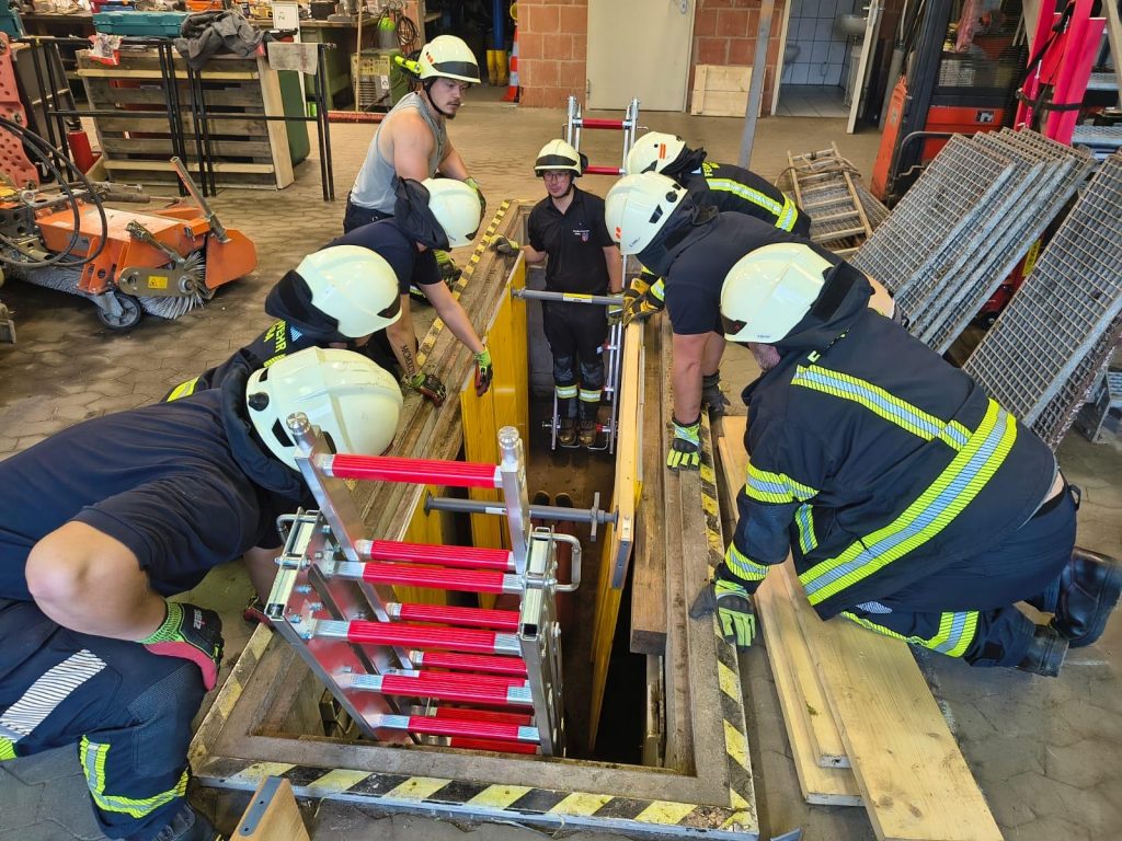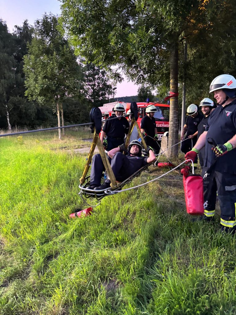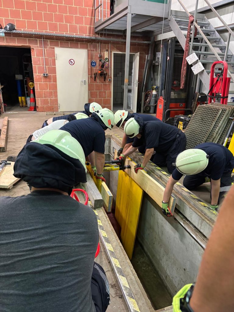 Hier musste eine einsturzgefährdete Grube gesichert werden. Dabei konnten die Teilnehmenden mit dem umfangreichen Material aus dem AB-Rüst arbeiten.