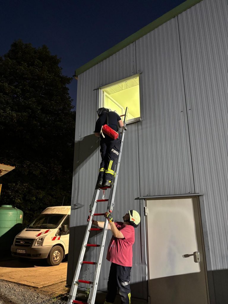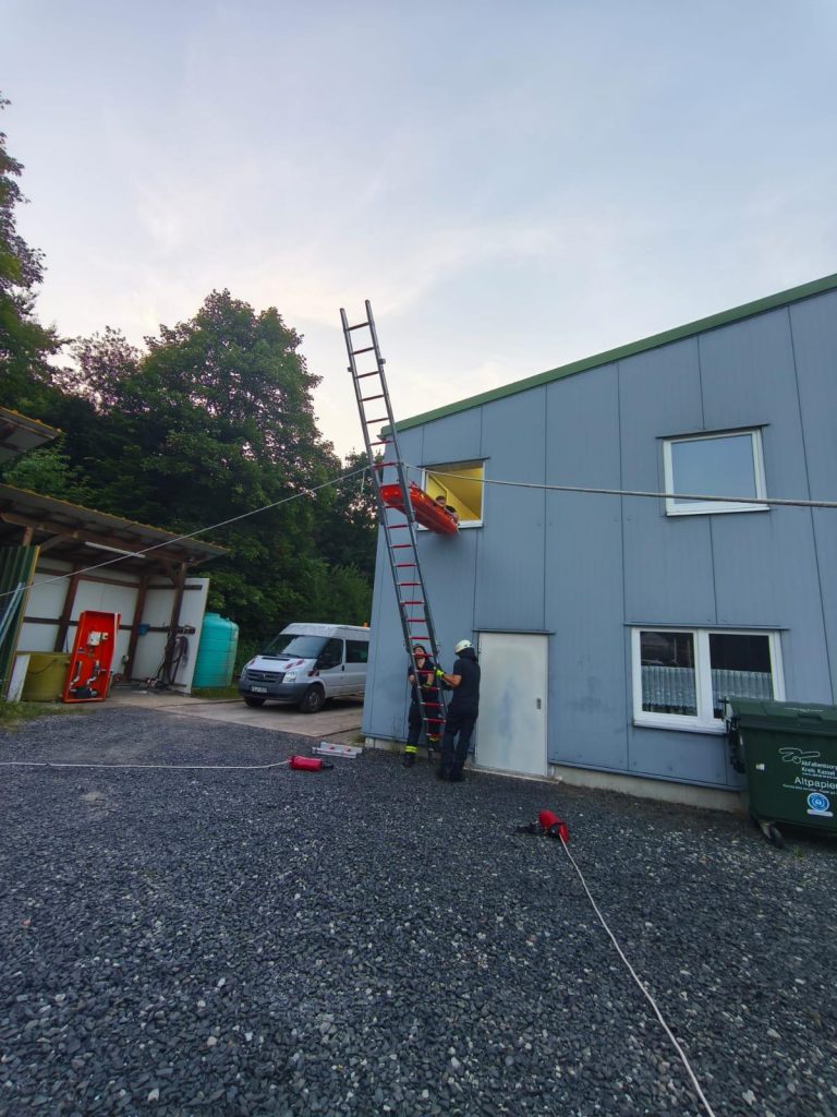 An dieser Station wurde die Rettung einer Person aus dem 1. Obergeschoss geübt mithilfe einer Steckleiter und einer Schleifkorbtrage.