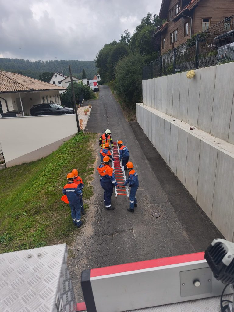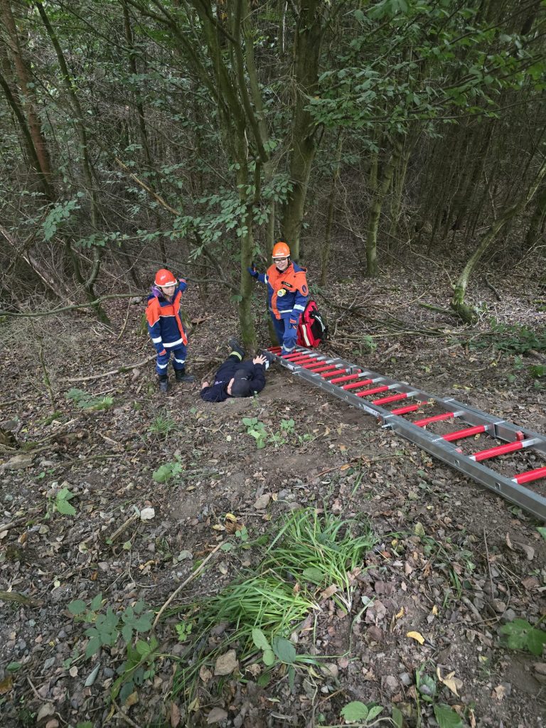 Nach kurzer Pause wurden wir zu einer „gestürzten Person in unwegsamem Gelände“ alarmiert. In einem Waldstück fanden wir eine verletzte Person im Hangbereich. Mit Leiter und Seilen sicherten wir den Zugang und zogen die Person mithilfe eines Spineboards zurück nach oben. Auch dieser Einsatz verlangte viel Zusammenarbeit und gegenseitiges Vertrauen.