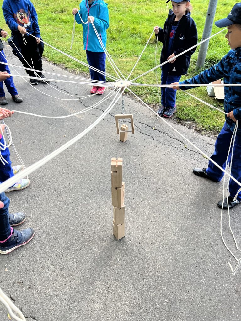 An der Einsatzstelle angekommen, baute die eine Gruppe von Jugendlichen und Kindern erst einmal die Wasserversorgung auf und die anderen die Spielstationen. Während die Spielegruppe mit viel Geschick einen Fröbelturm baute und mit einem Besen Minigolf spielte, löschte die Einsatztruppe den imaginären Brand, nachdem die Wasserversorgung stand.