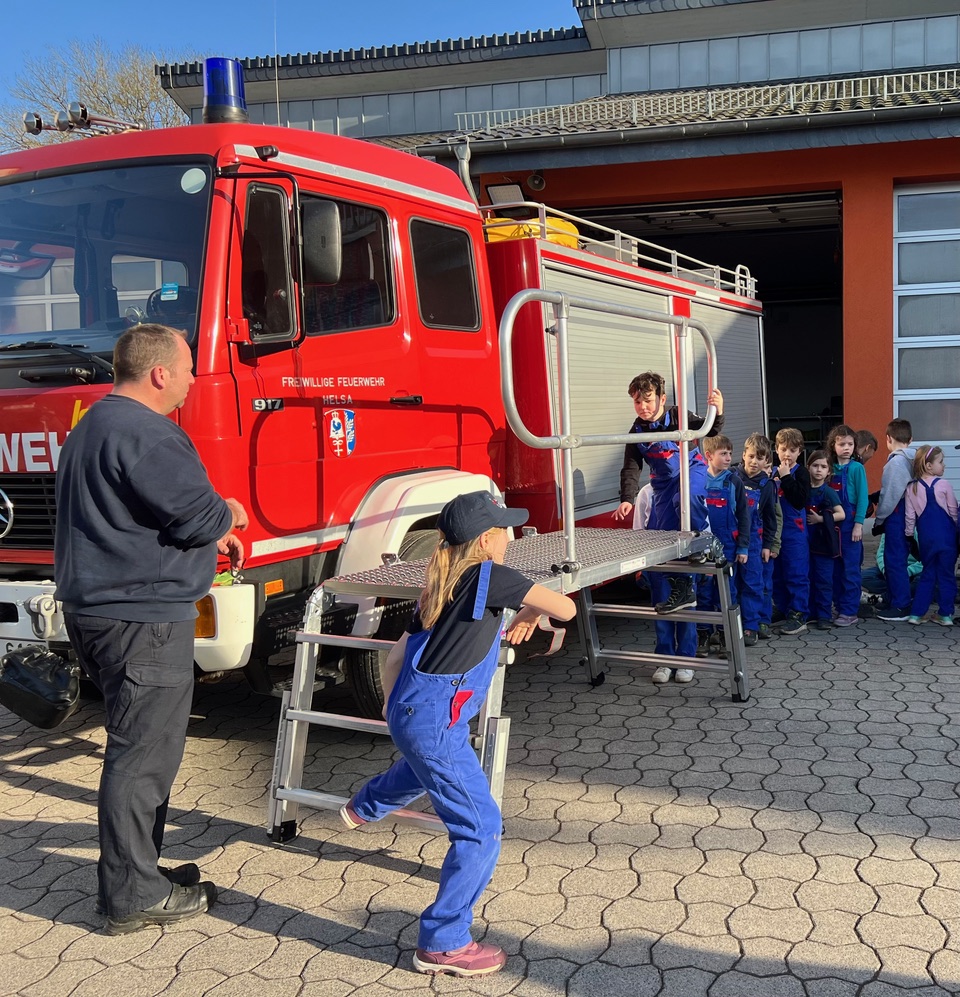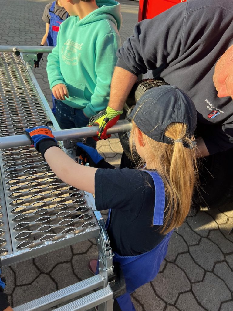 Tim zeigte den Kindern Schritt für Schritt den Aufbau der Rettungsplattform und erklärte ihre verschiedenen Einsatzmöglichkeiten. Nachdem sie als Arbeitsplattform aufgebaut war, durften alle Kinder einmal hinaufsteigen und einen Blick in das Führerhaus des Rüstwagens werfen.